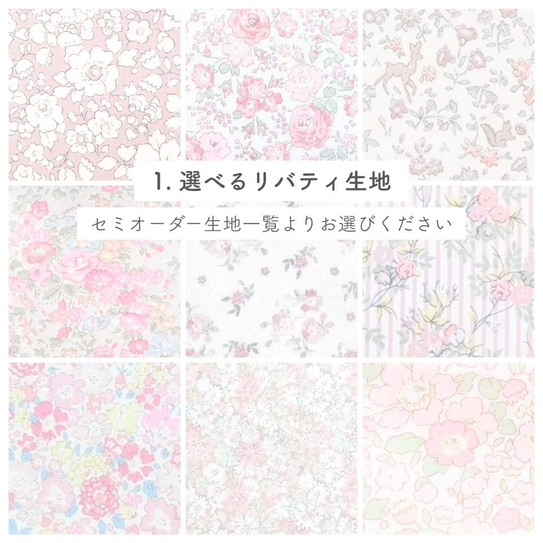 1. リバティ生地(※裁断位置により柄の出方は一点ずつ異なります。)