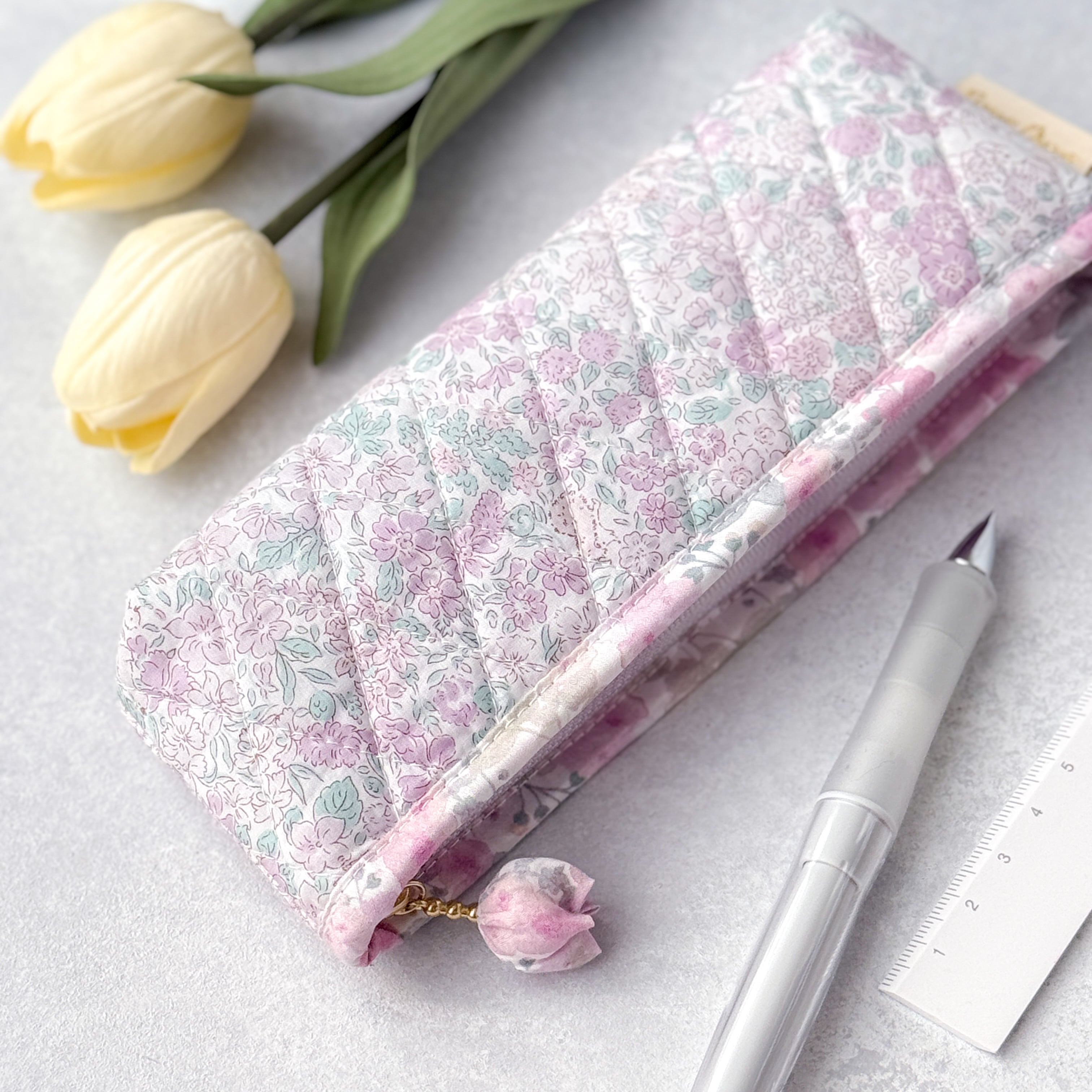 3種類のリバティを贅沢に使用した、スリムで愛らしい「ダイヤキルトペンポーチ」です。