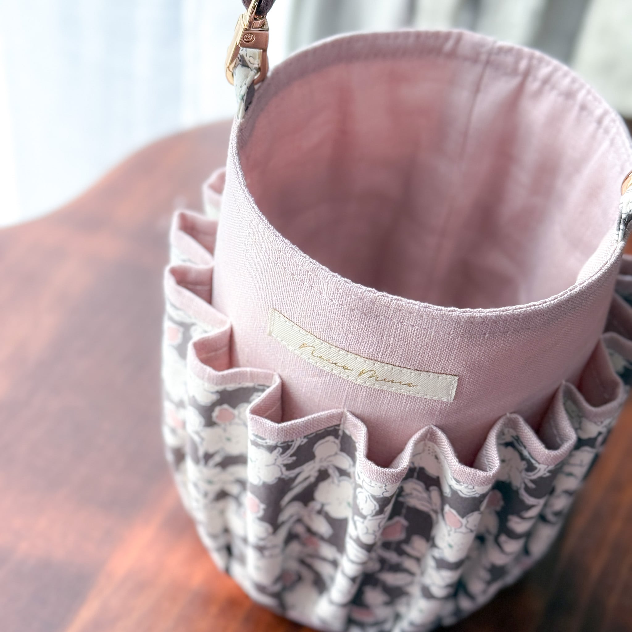 リバティプリントと、ナチュラルな風合いが魅力のリネンを組み合わせた、持ち運びのできるお道具入れです。