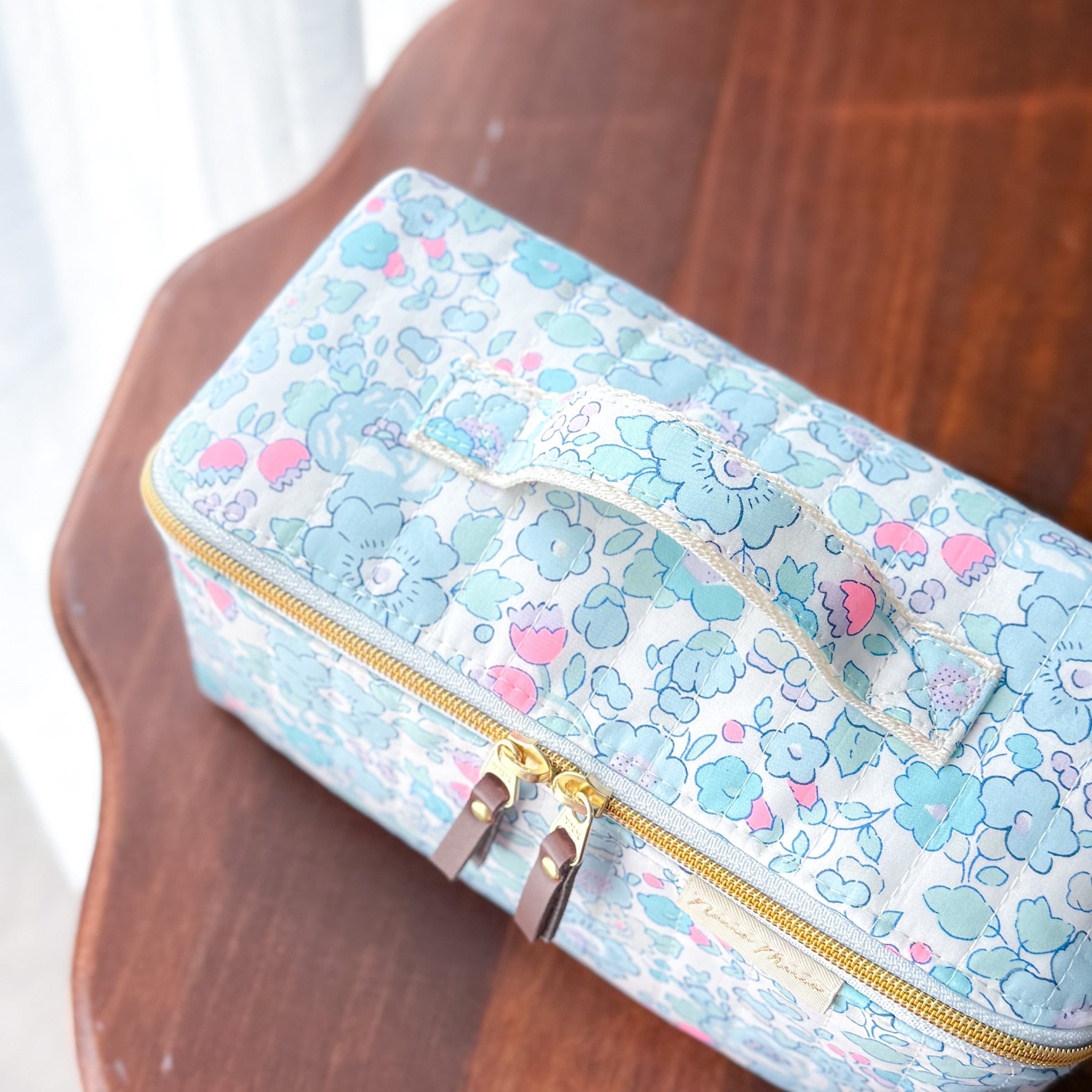 【リバティ】ガバッと開くハンドル付きスクエアポーチ|仕切りファスナーでスッキリ整理(ベッツィK)