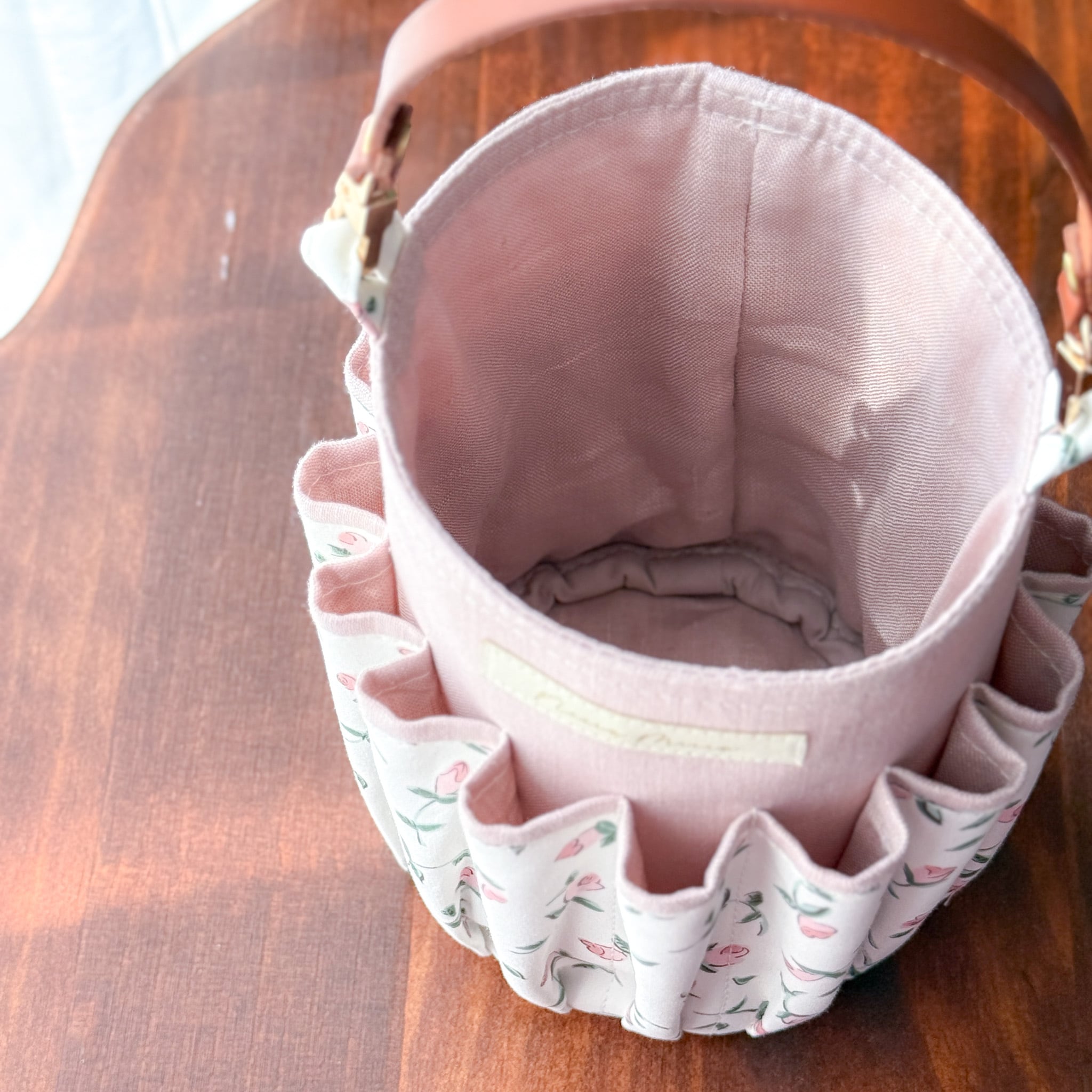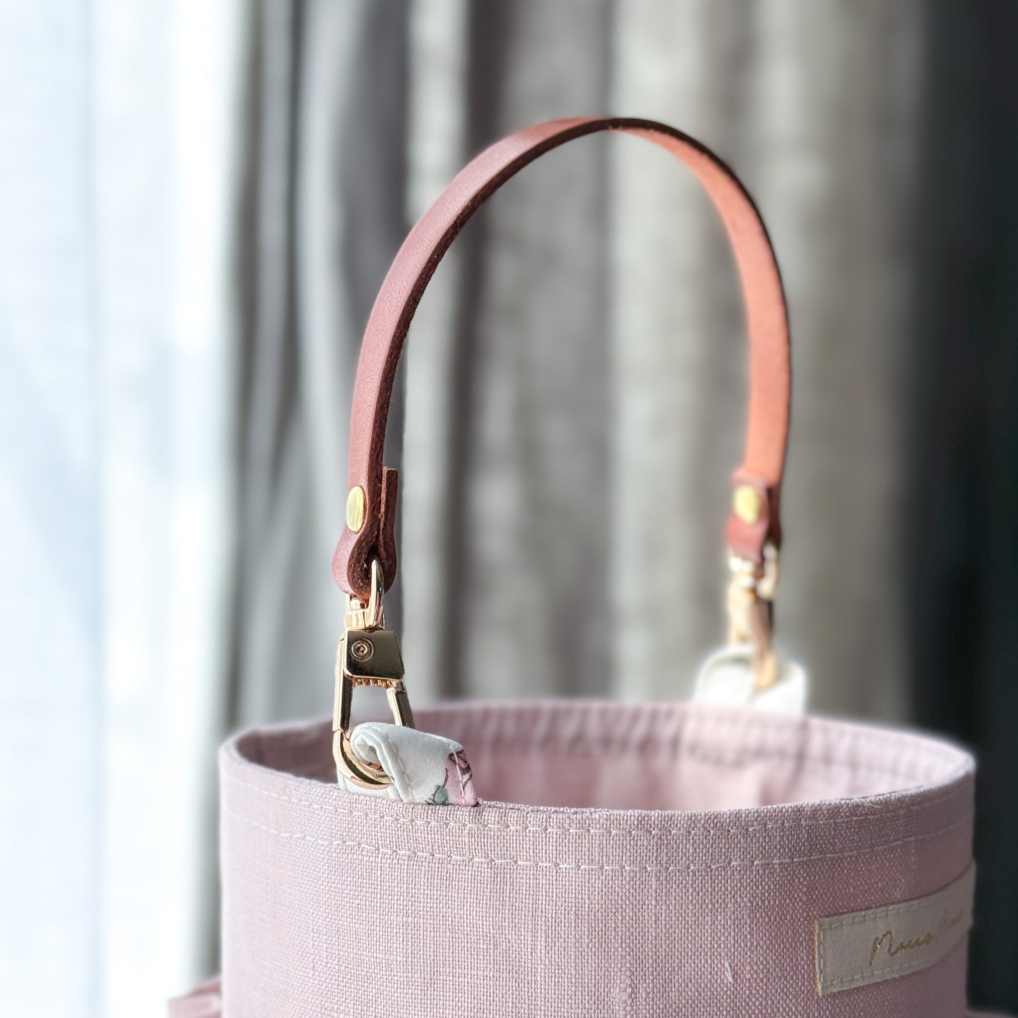 ・アイロン: 表地(リバティ・リネン側)から低温〜中温で。革部分や金具は熱に弱いため、アイロンが直接触れないようご注意ください。