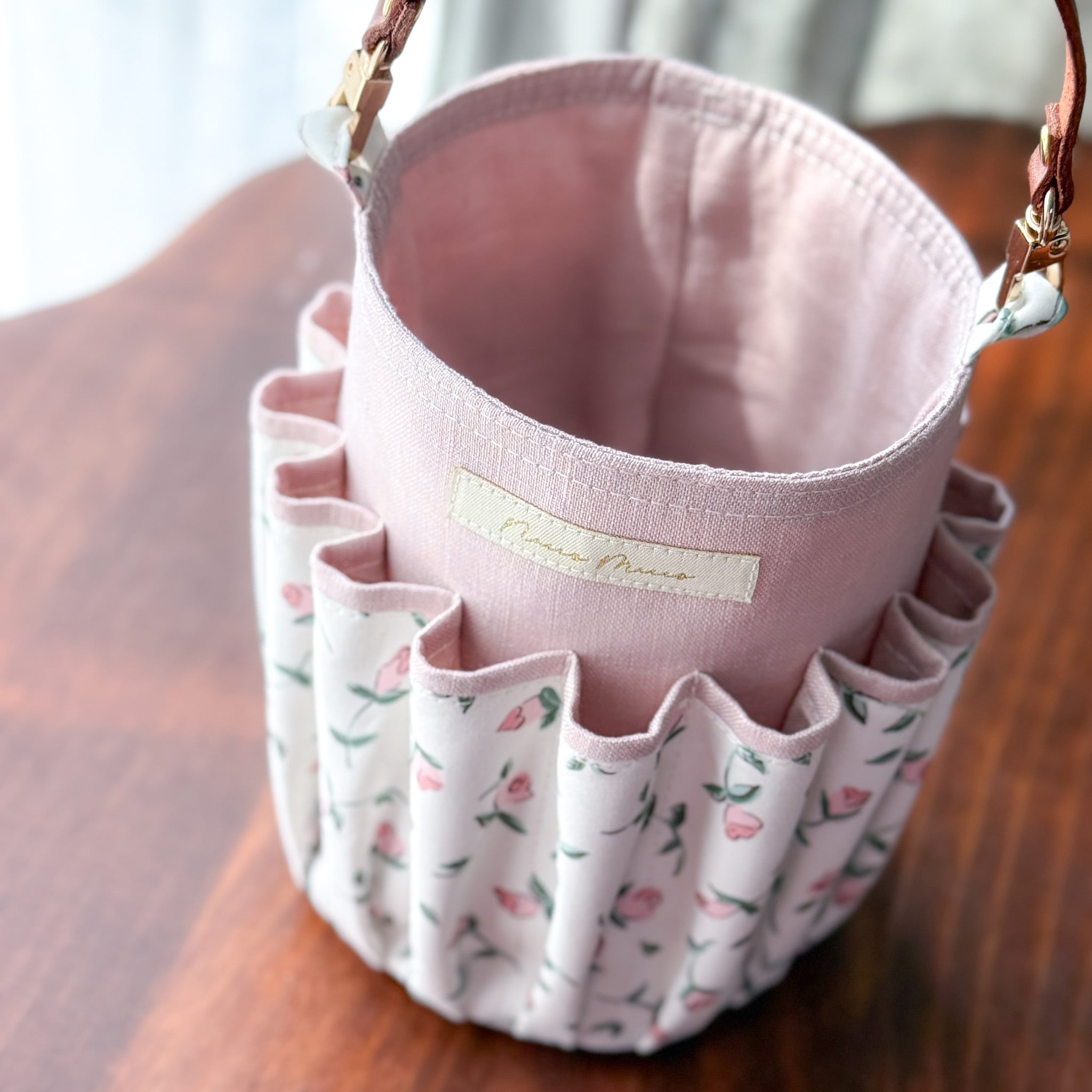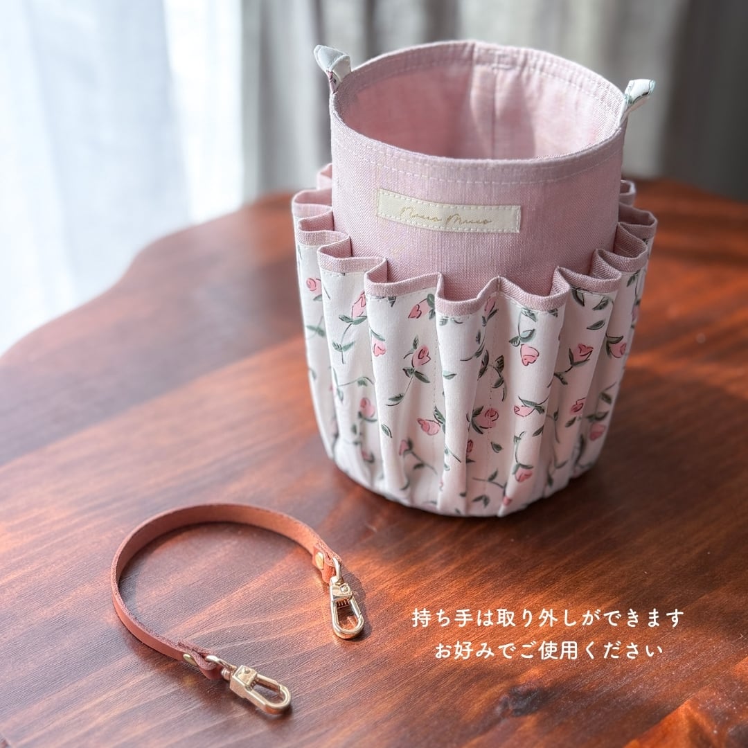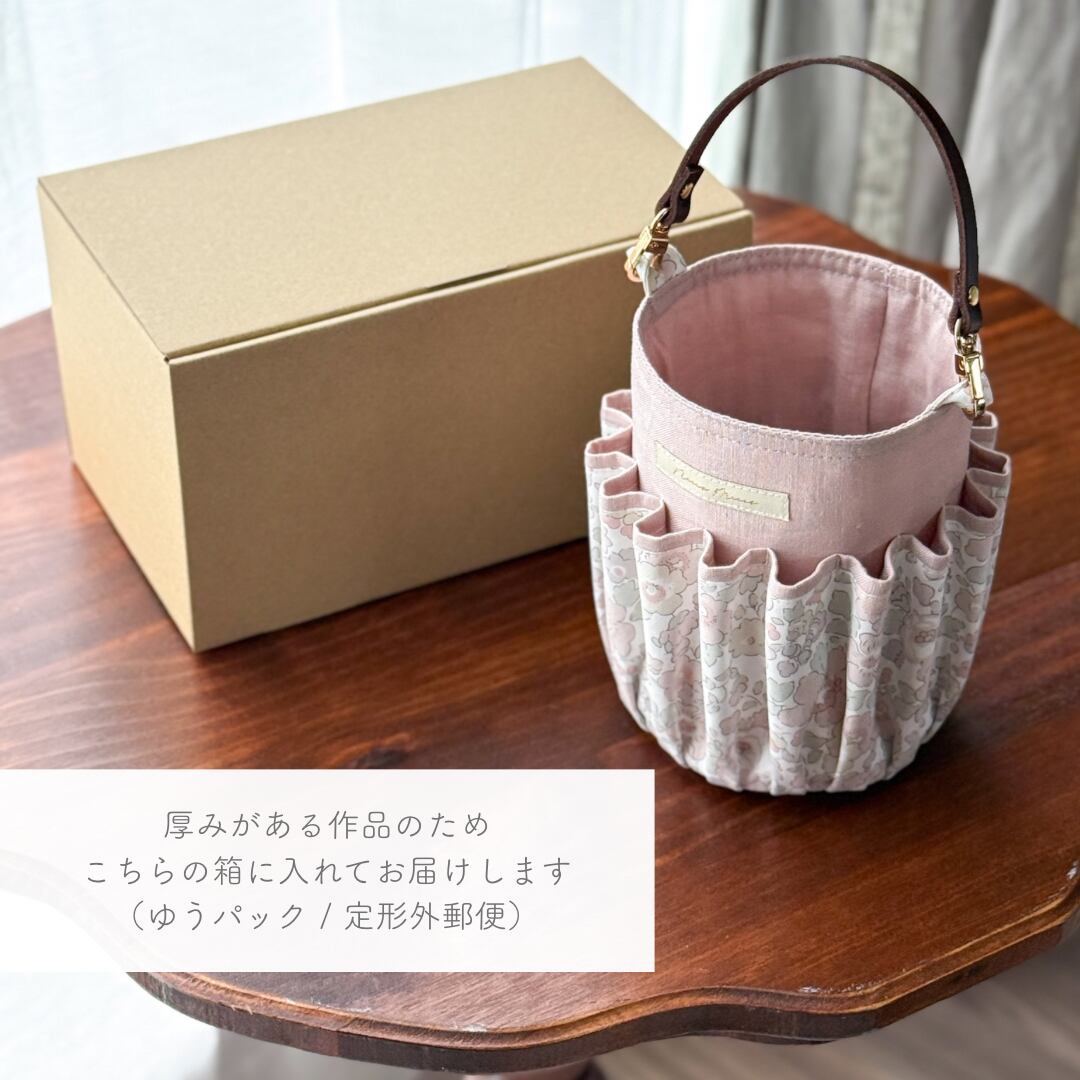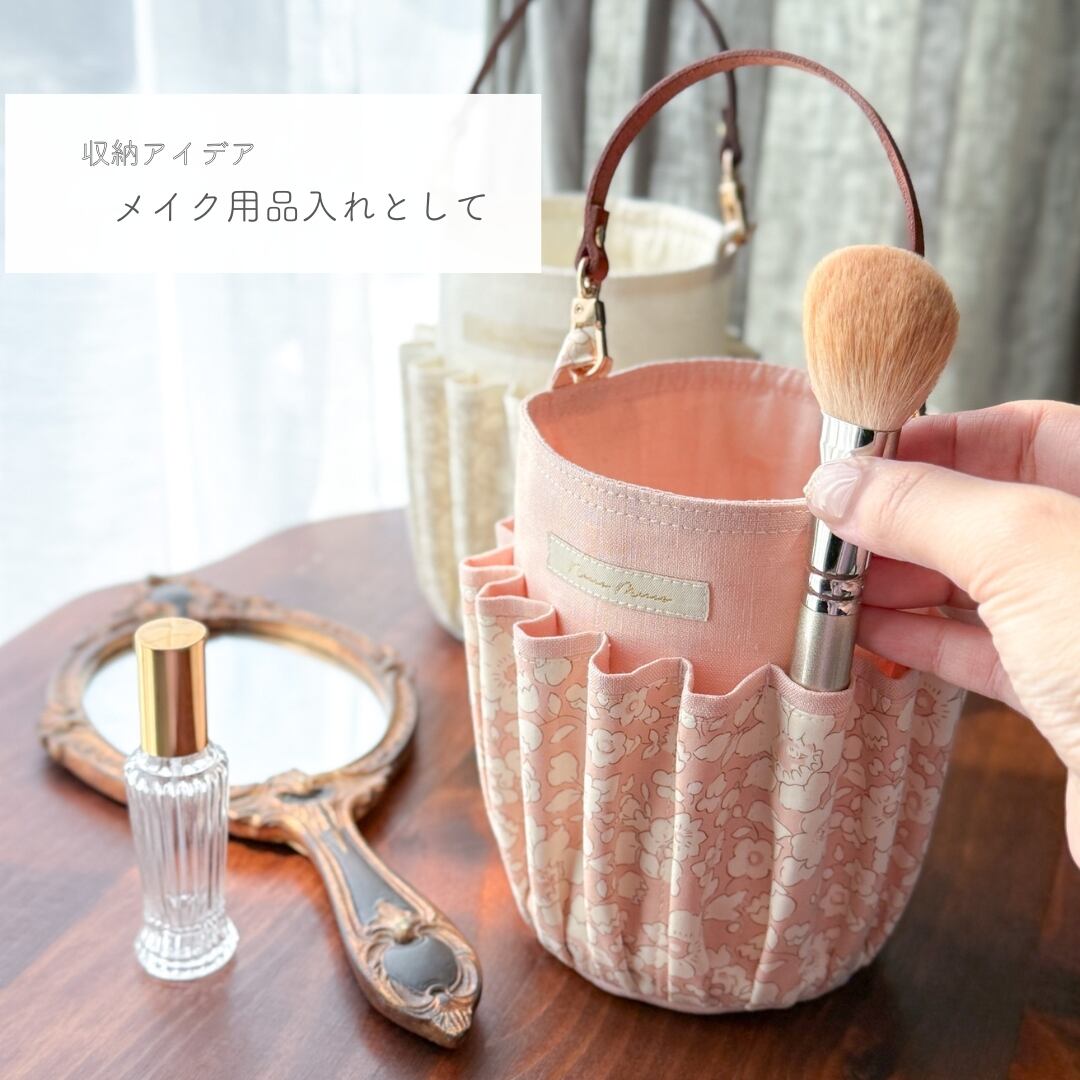 リバティプリントと、ナチュラルな風合いが魅力のリネンを組み合わせた、持ち運びのできるお道具入れです。