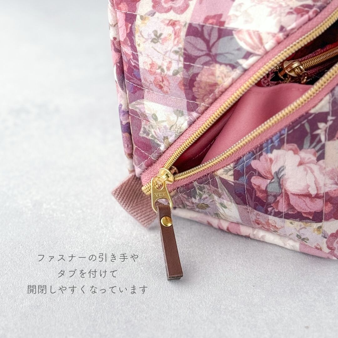 仕様:ガバッと開くファスナー開閉、内側ファスナー仕切りポケット×1、内ポケット×1、開閉サポートタブ付き、接着芯2枚張り(厚手仕上げ)