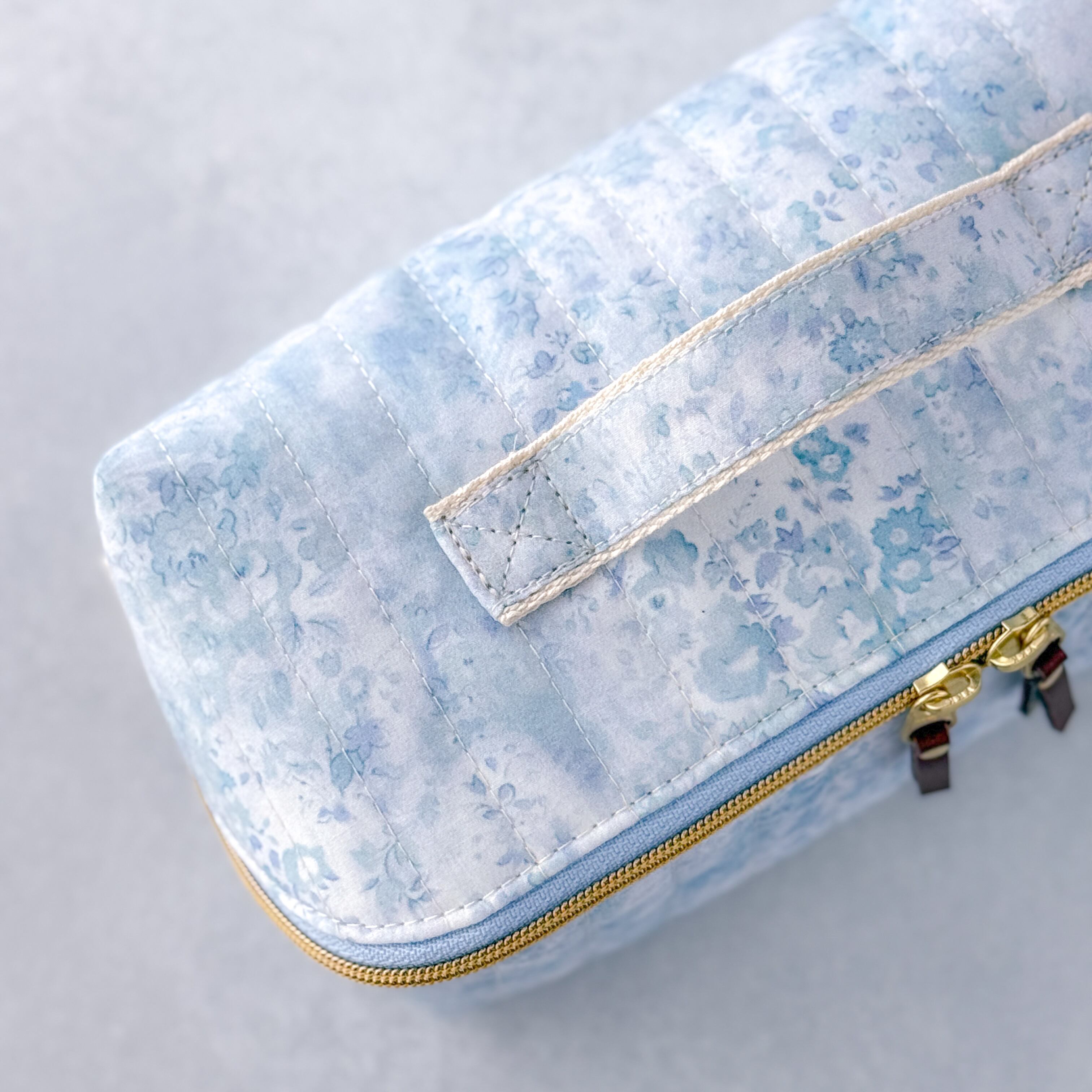 リバティプリントを使用した、スクエア型の大容量マルチポーチです。