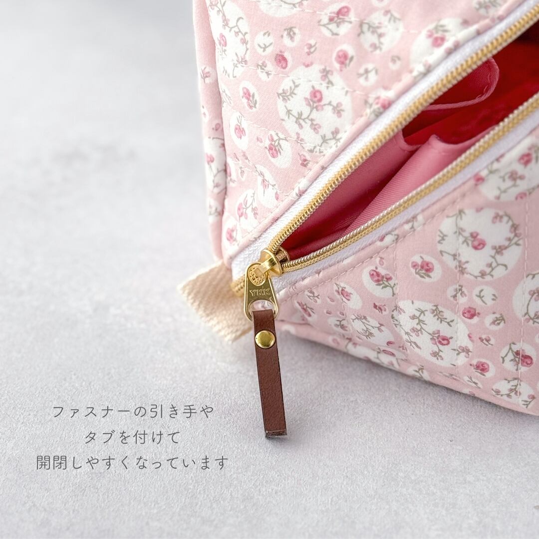 仕様:ガバッと開くファスナー開閉、内側ファスナー仕切りポケット×1、内ポケット×1、開閉サポートタブ付き、接着芯2枚張り(厚手仕上げ)