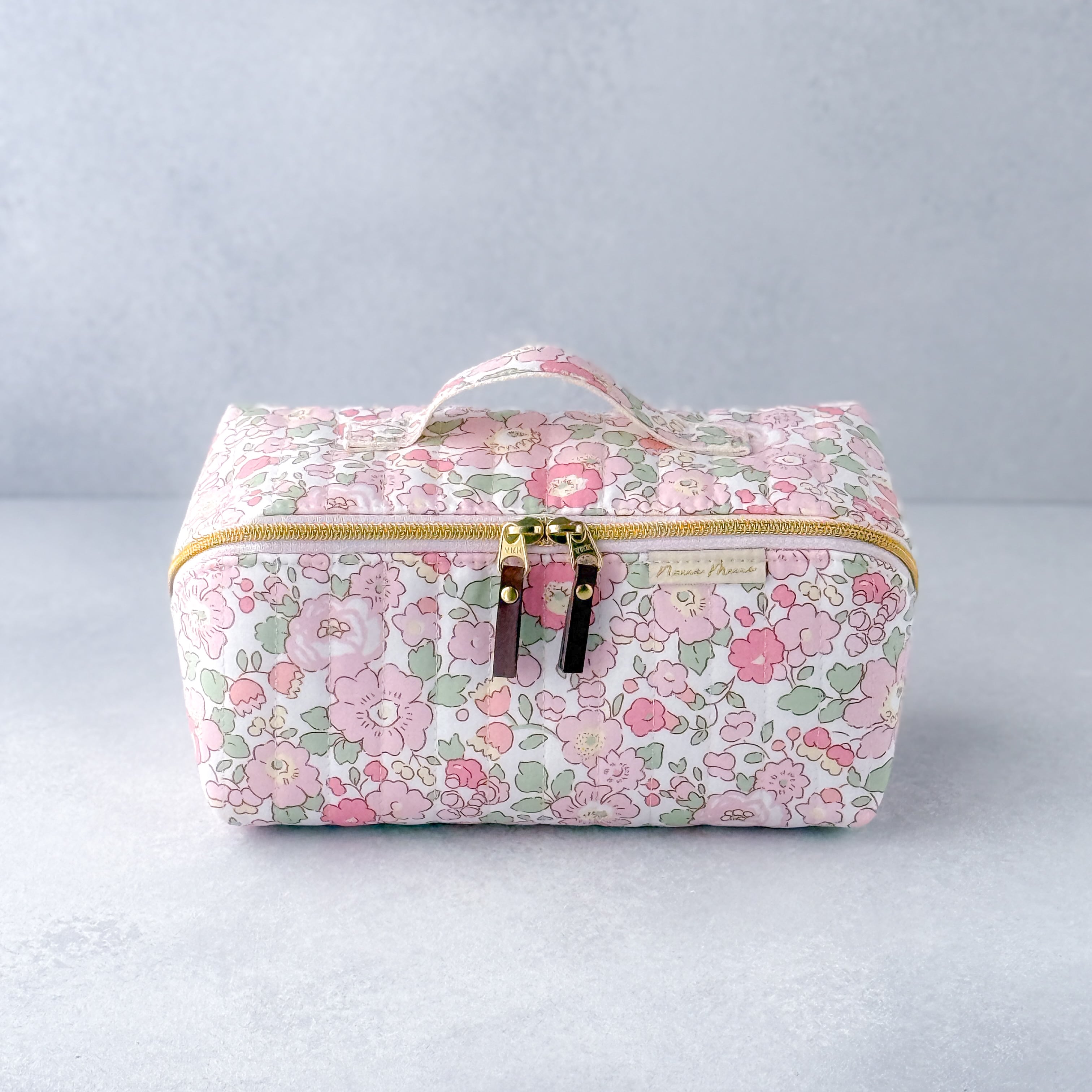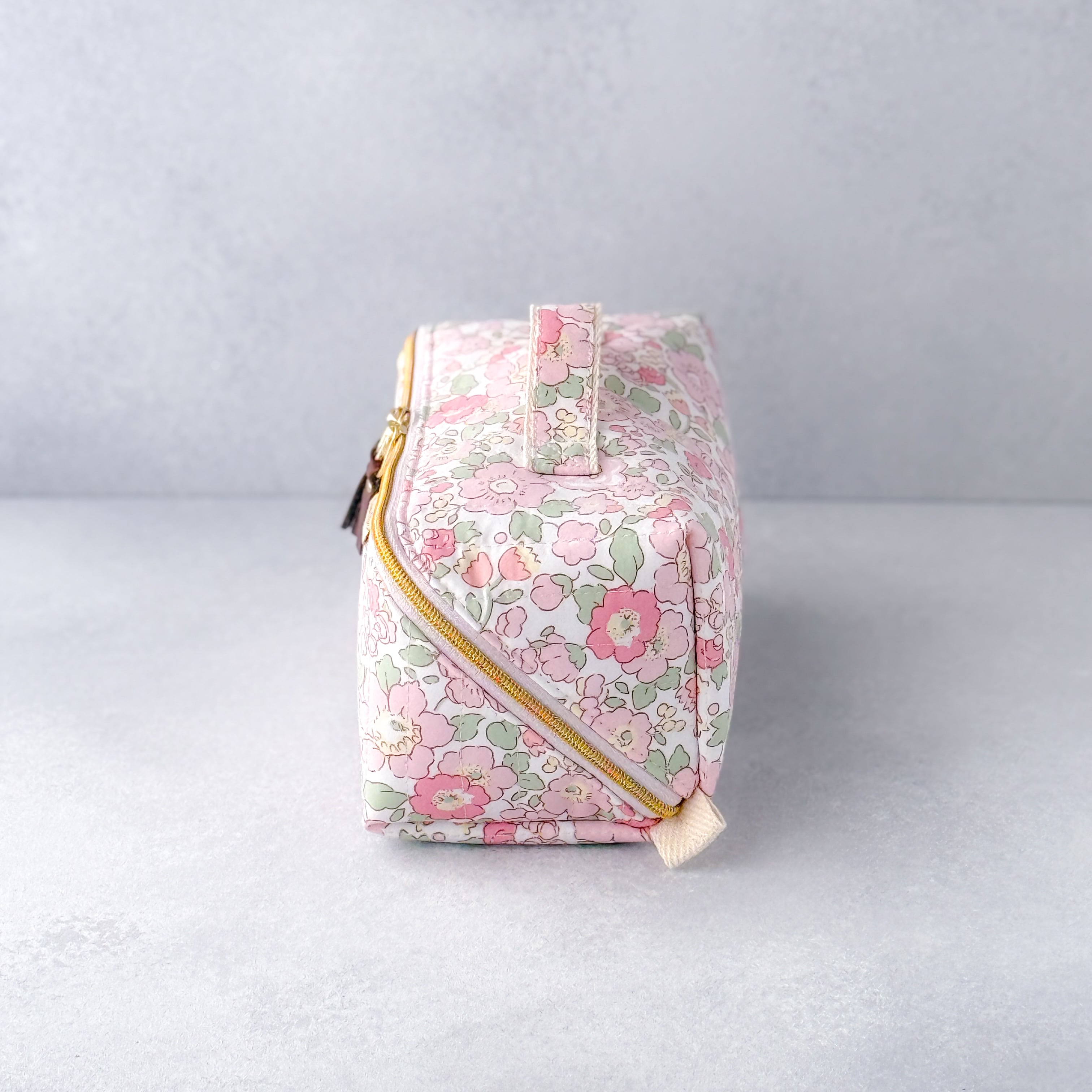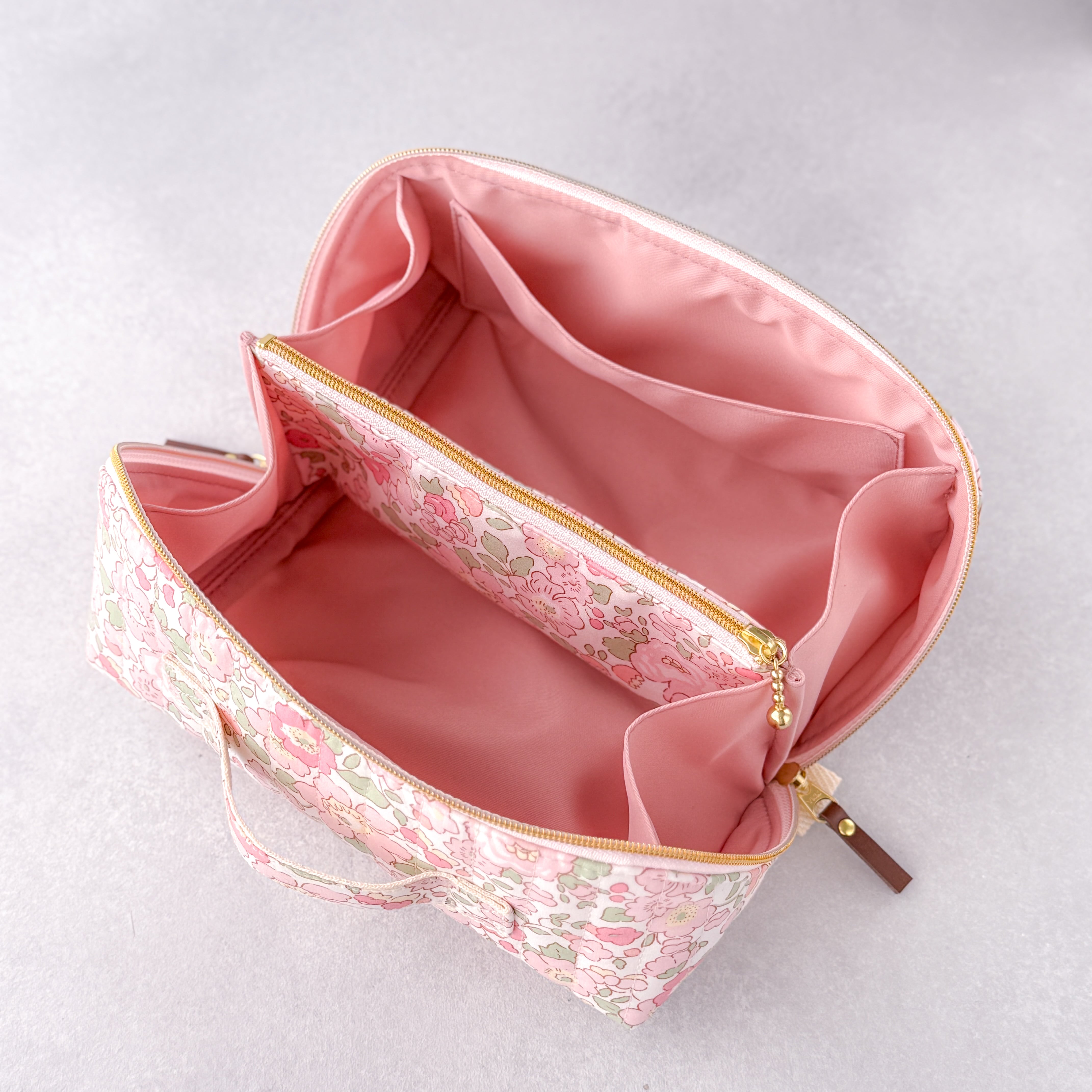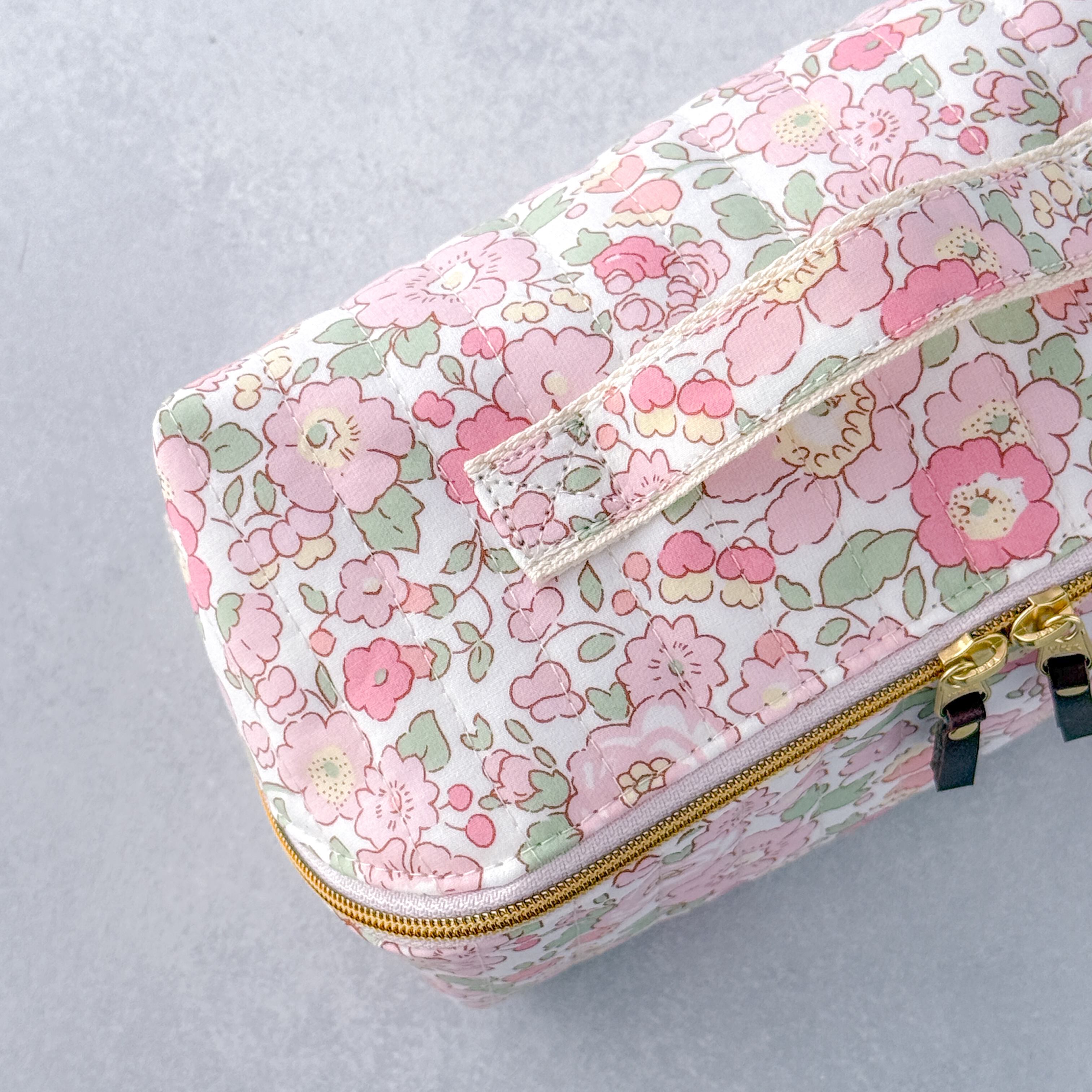 【訳あり・リバティ】ガバッと開くハンドル付きスクエアポーチ|仕切りファスナーでスッキリ整理(ベッツィ輸入)