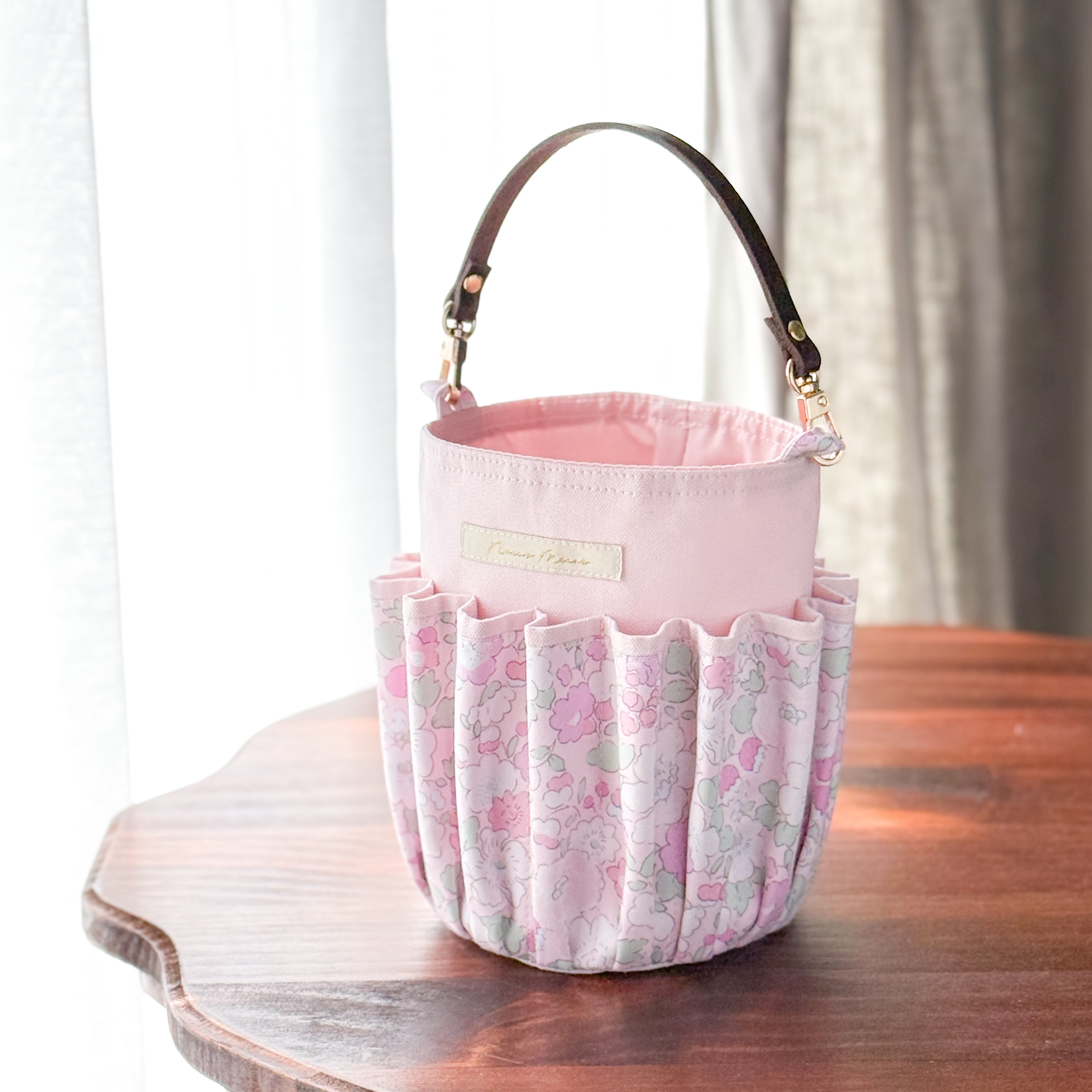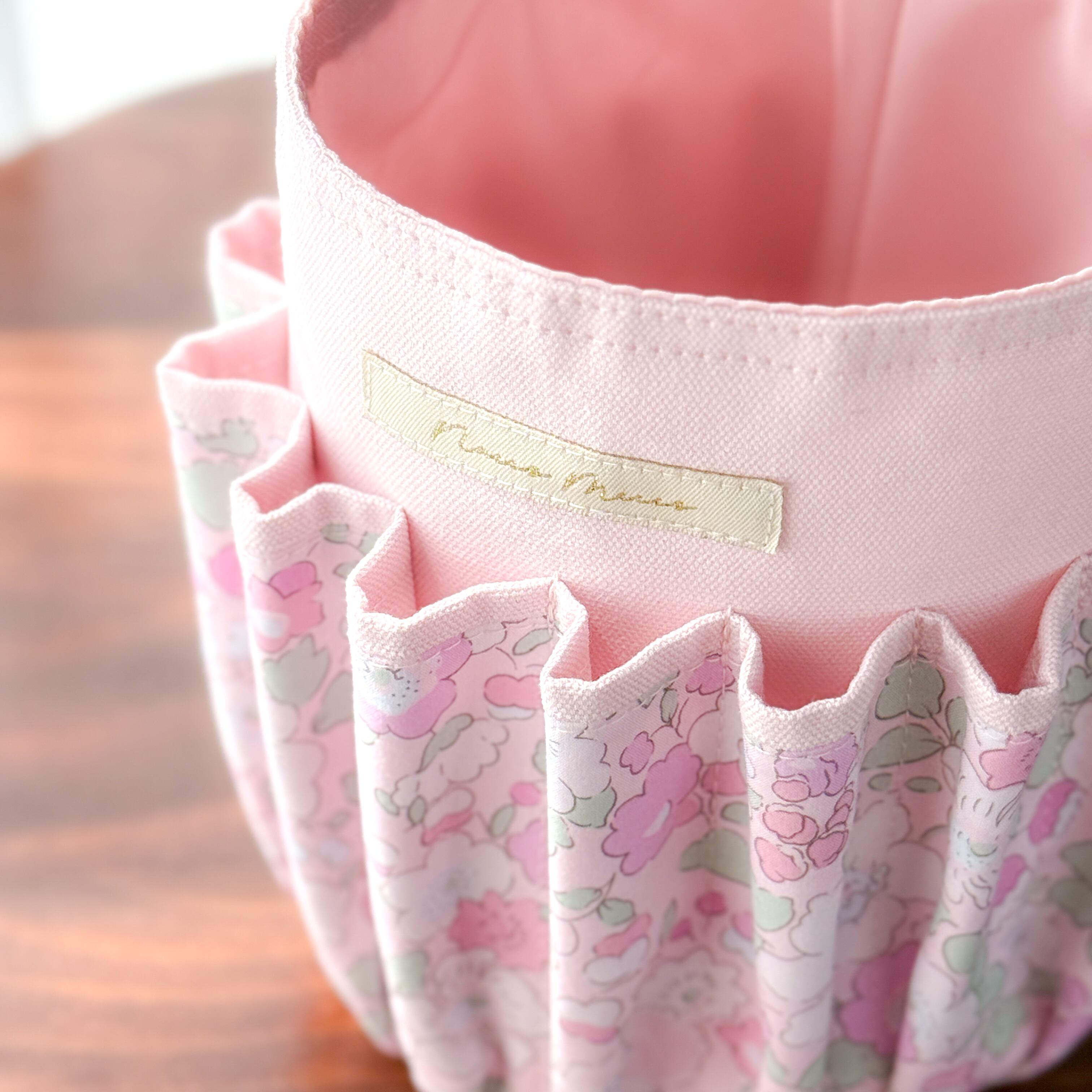 リバティプリントを使用した、持ち運びのできる便利なツールバスケットです。