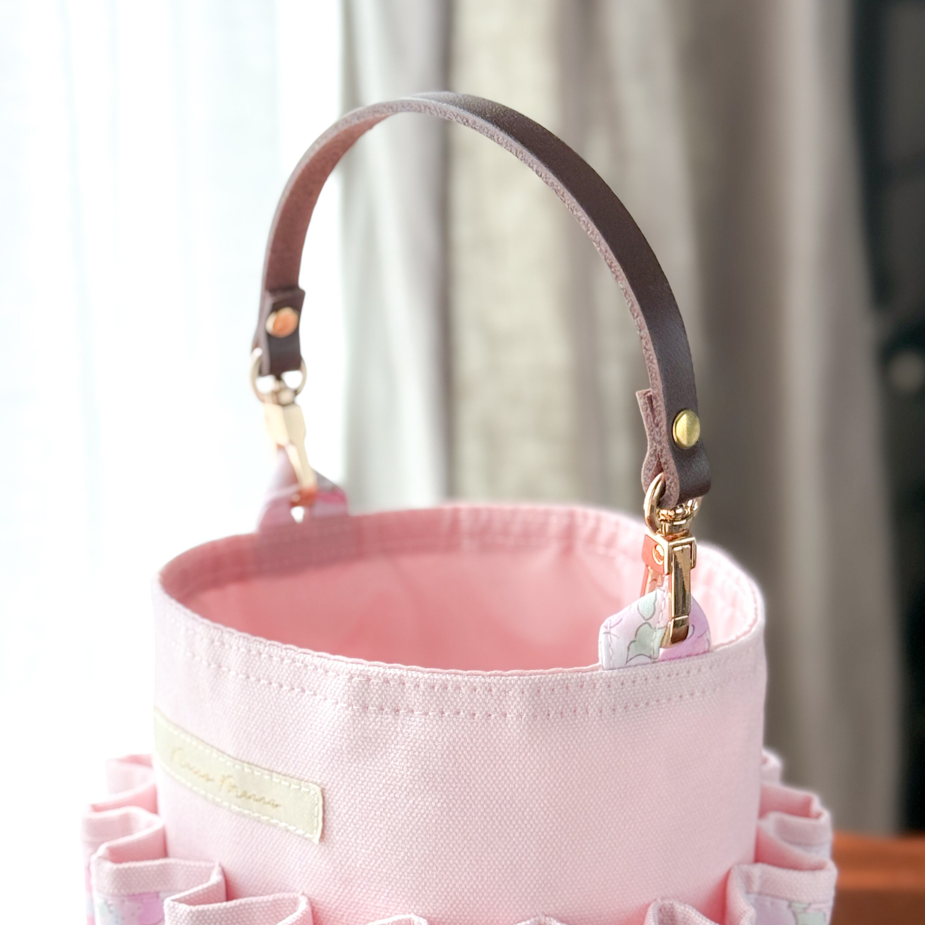 ・アイロン: 表地(リバティ・オックス側)から低温〜中温で。革部分や金具は熱に弱いため、アイロンが直接触れないようご注意ください。