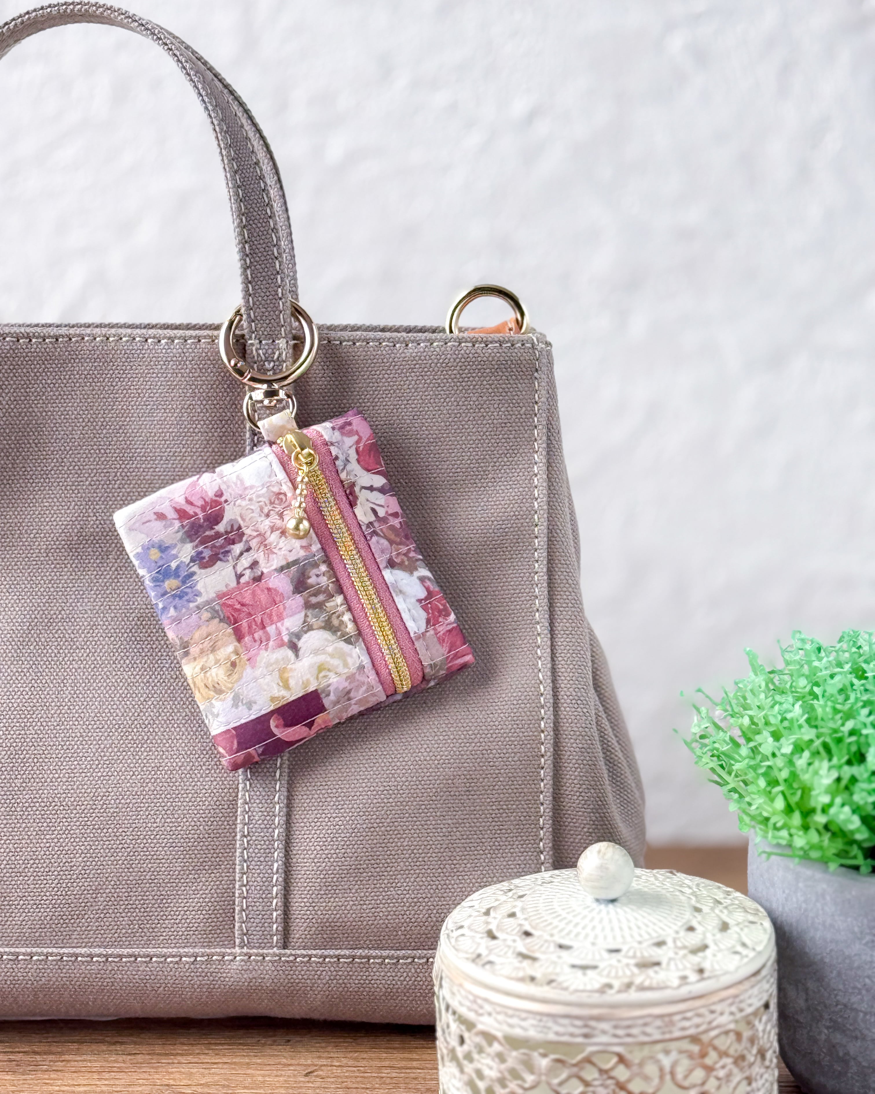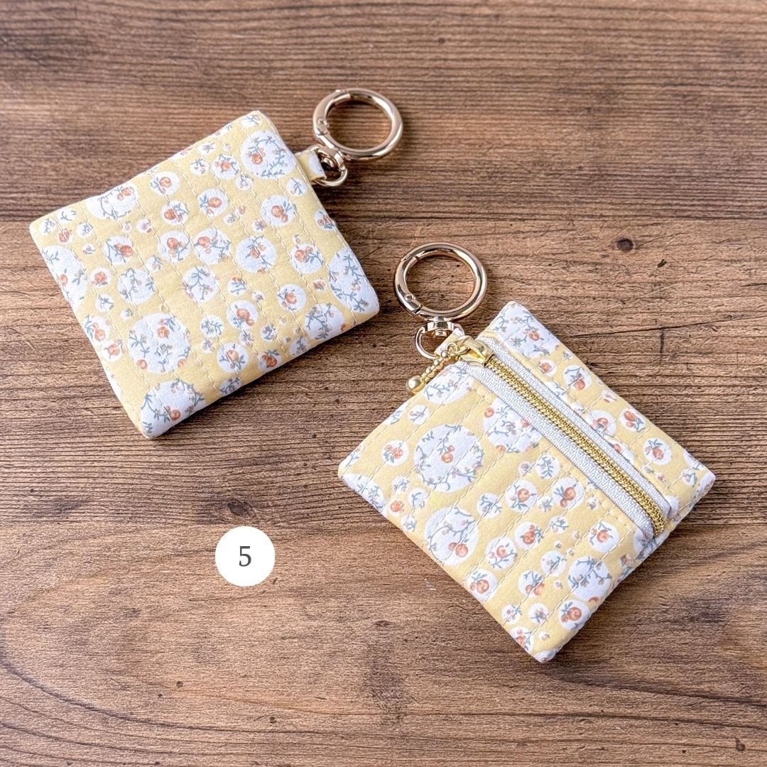 「スクエアポーチ」を制作するためにキルティングした際に出る、貴重なハギレを有効活用してお仕立てしました。