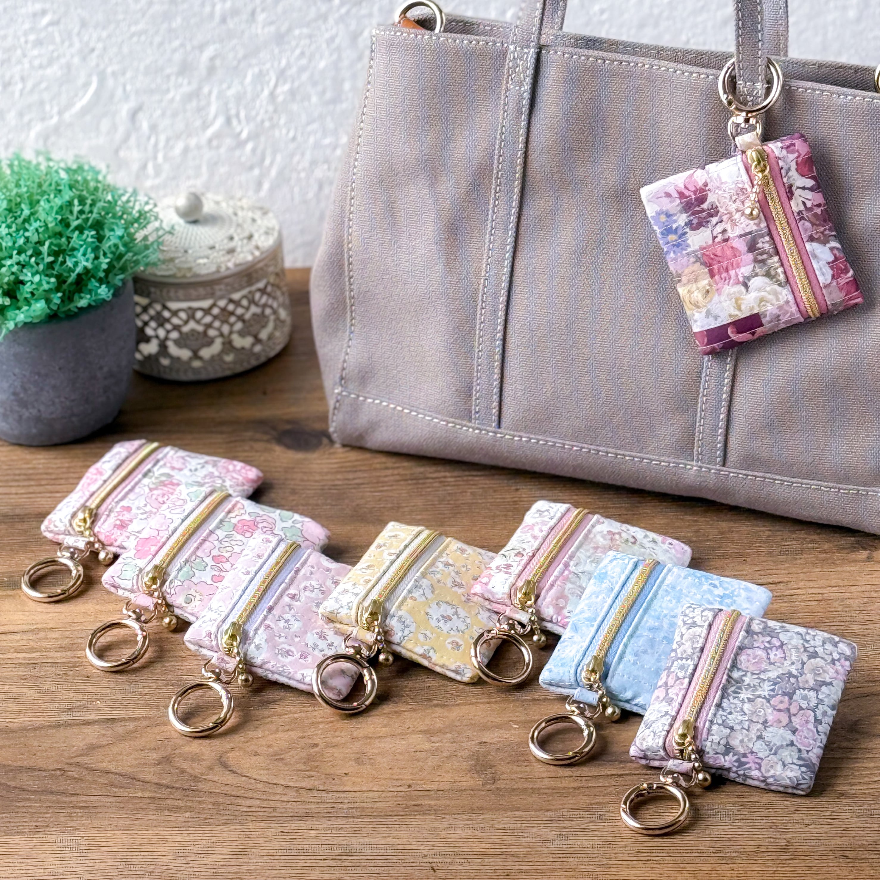 リバティプリントのミニミニスクエアポーチ(カラビナ付)
