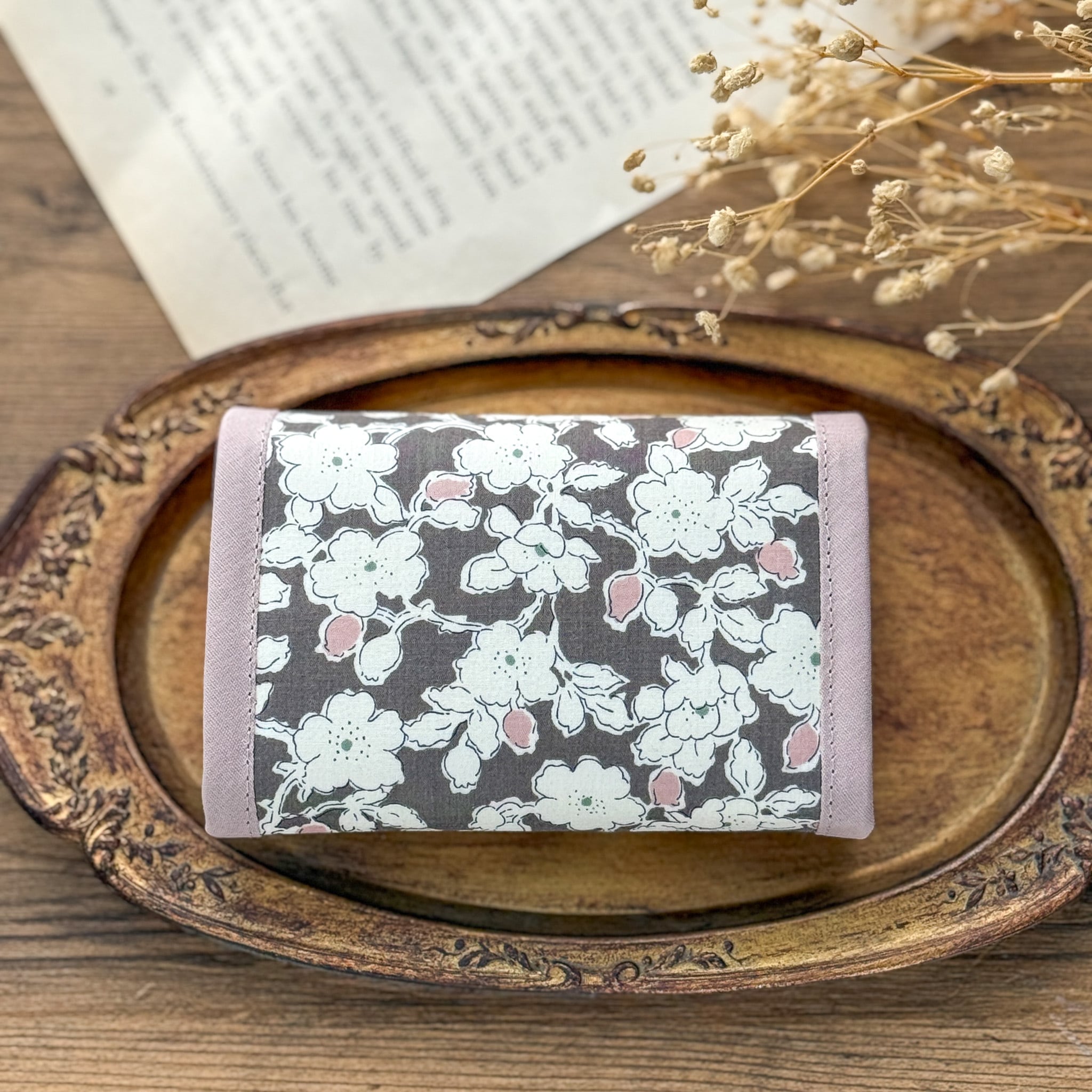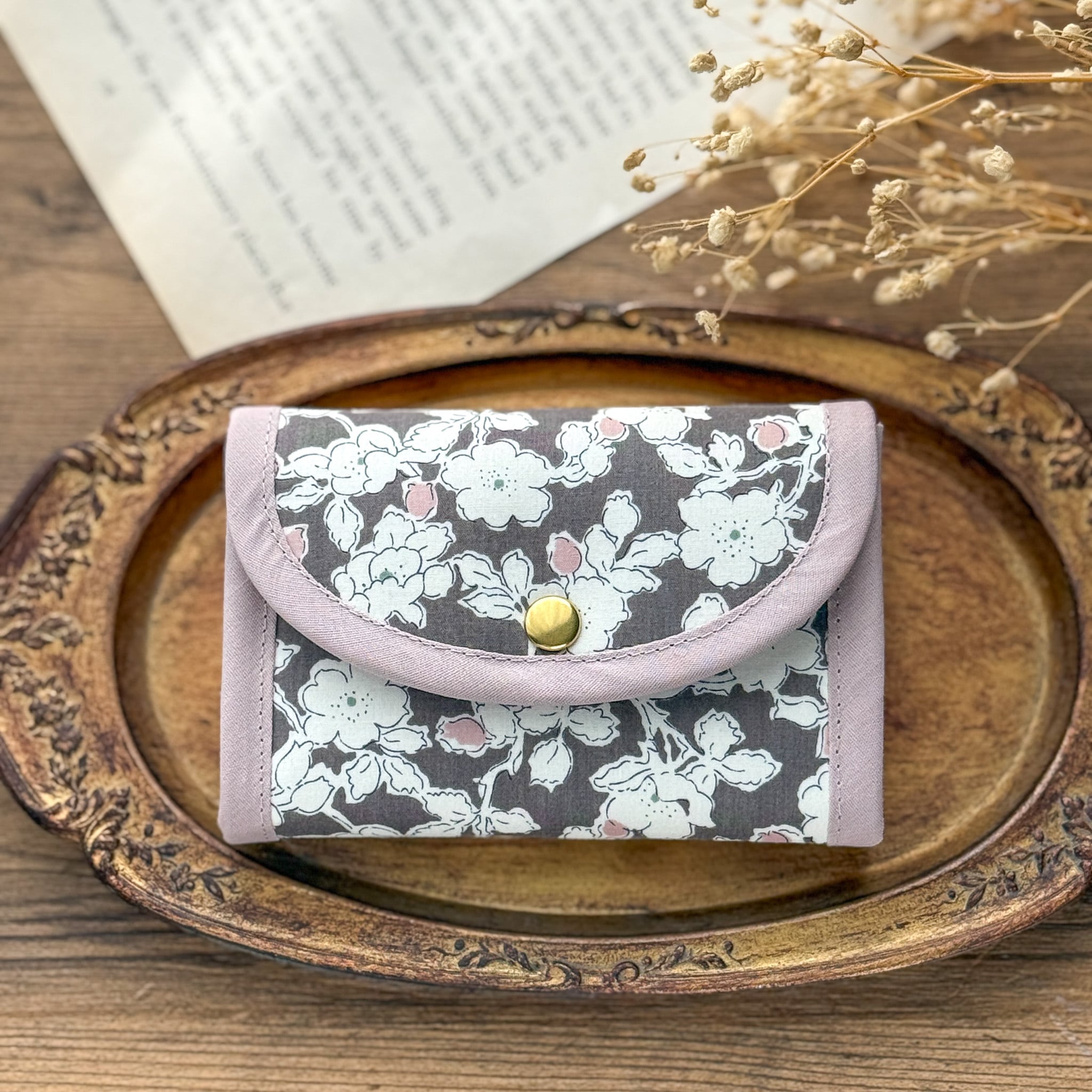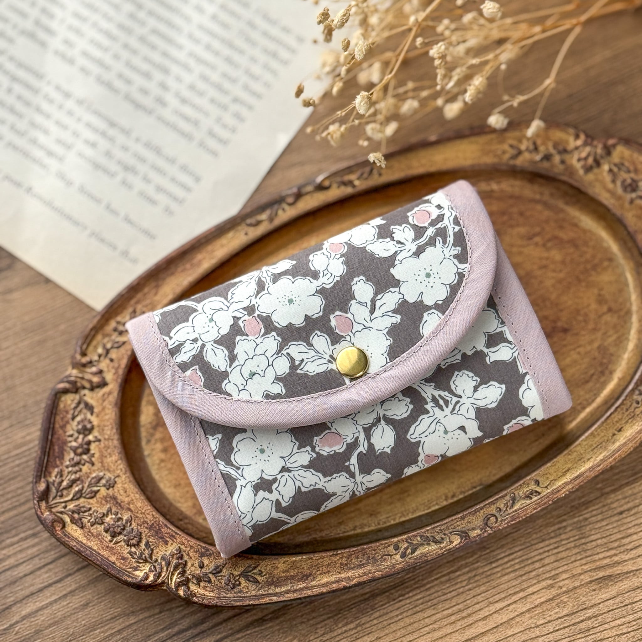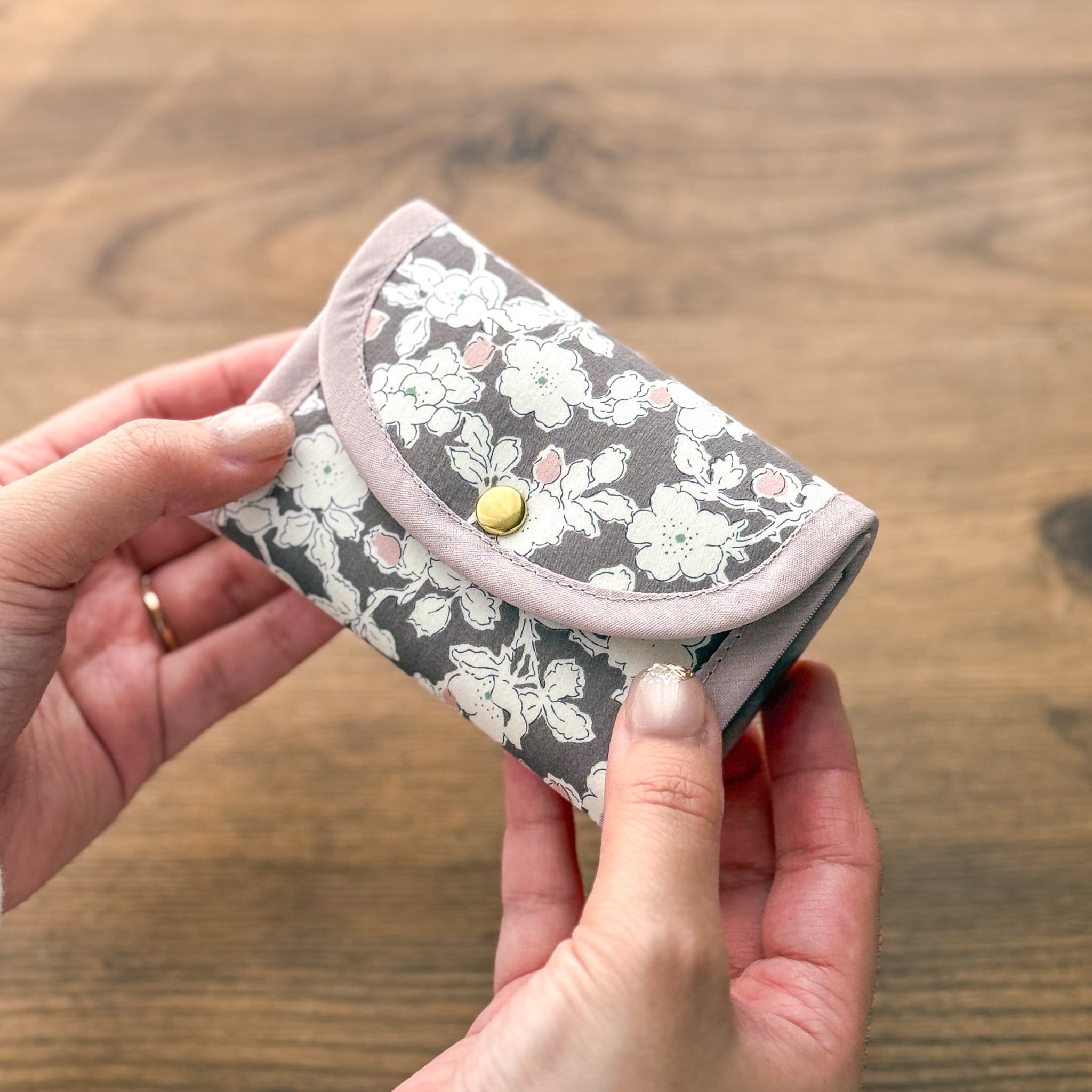 ●コンパクトなサイズ:手のひらに収まるサイズ感で、小さめのバッグにもすっきり収まります。リバティの華やかさを引き立てる、バイアスの組み合わせもポイントです。