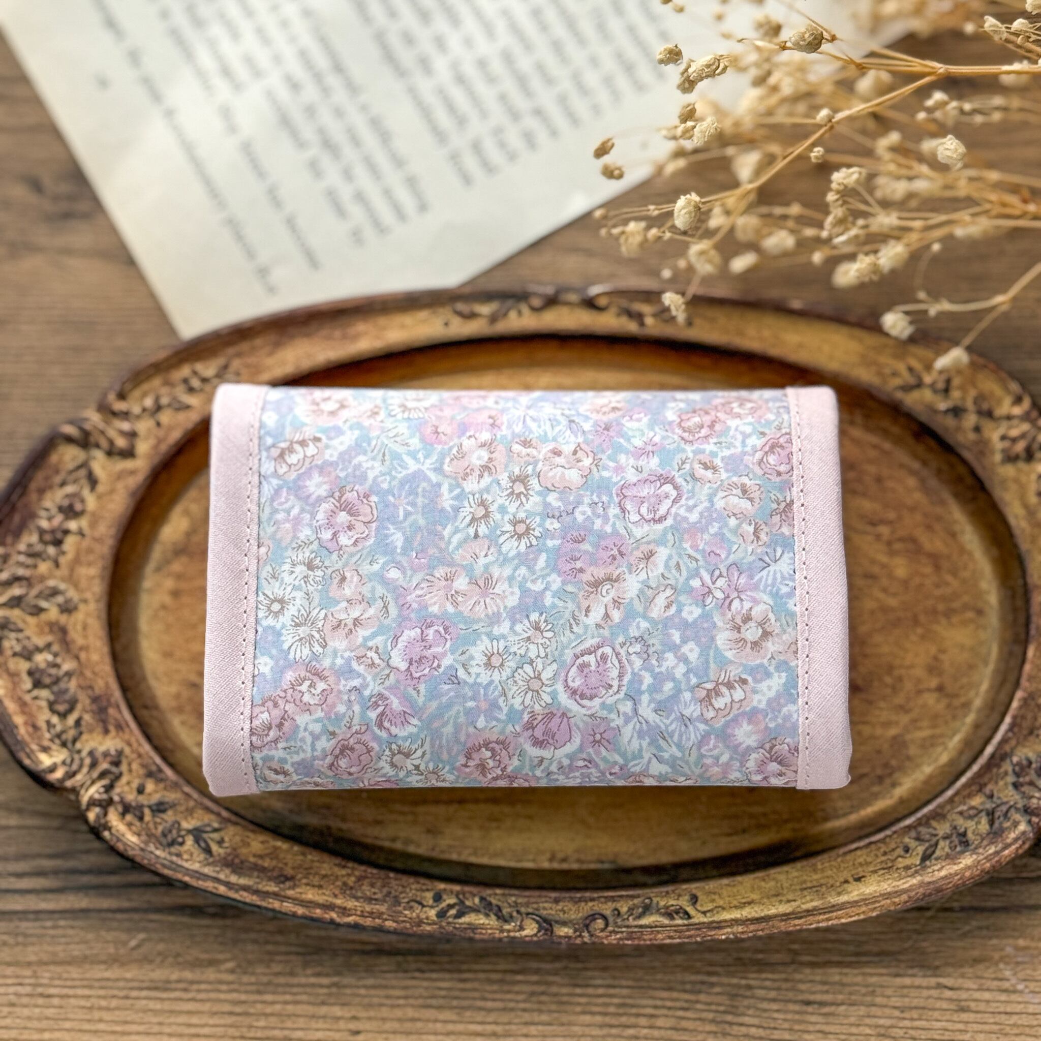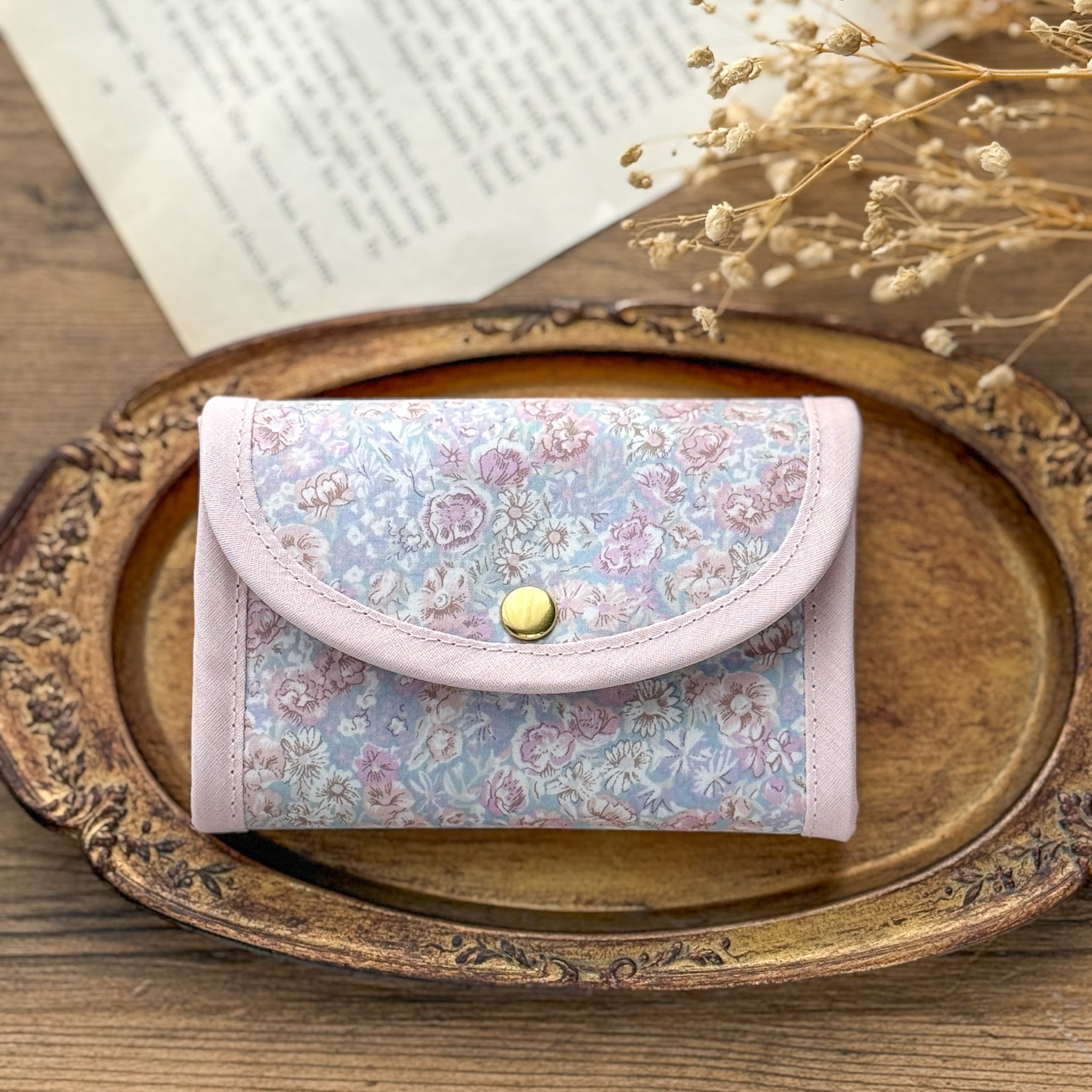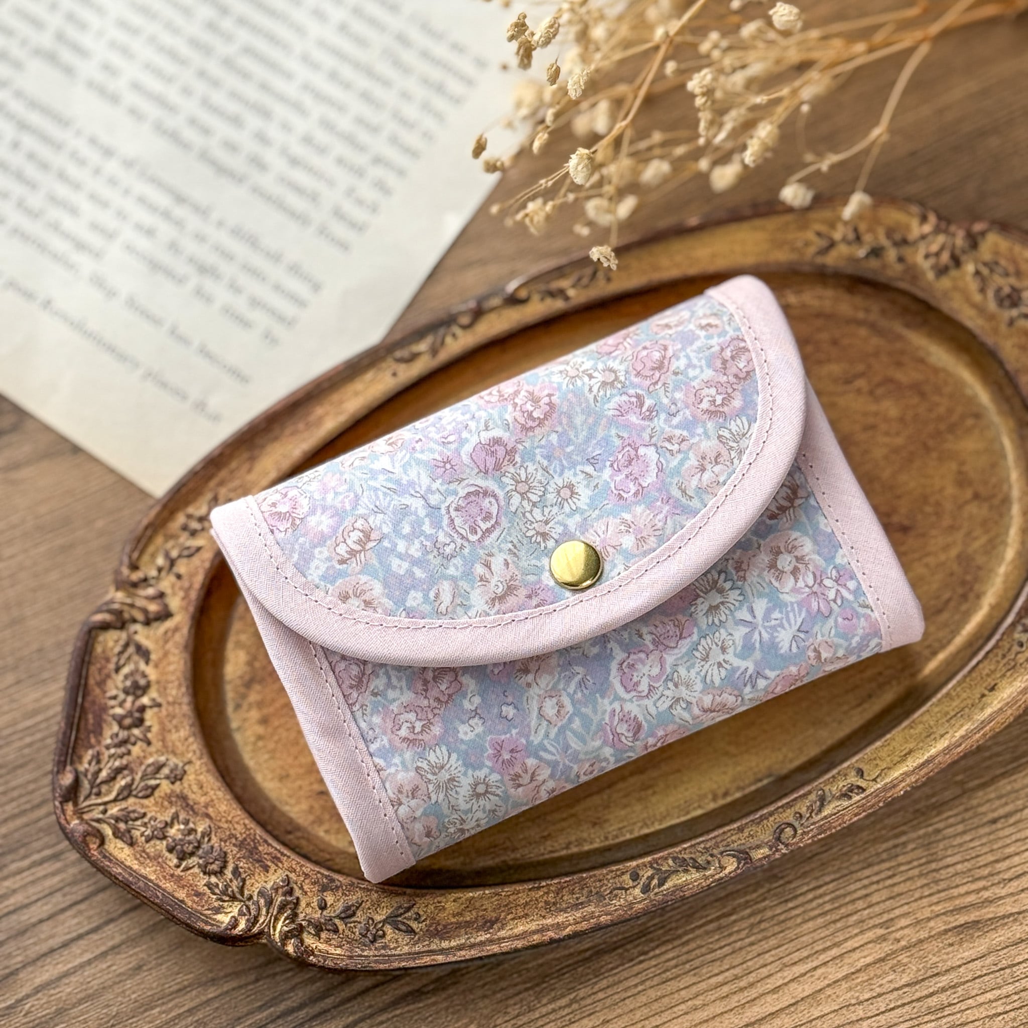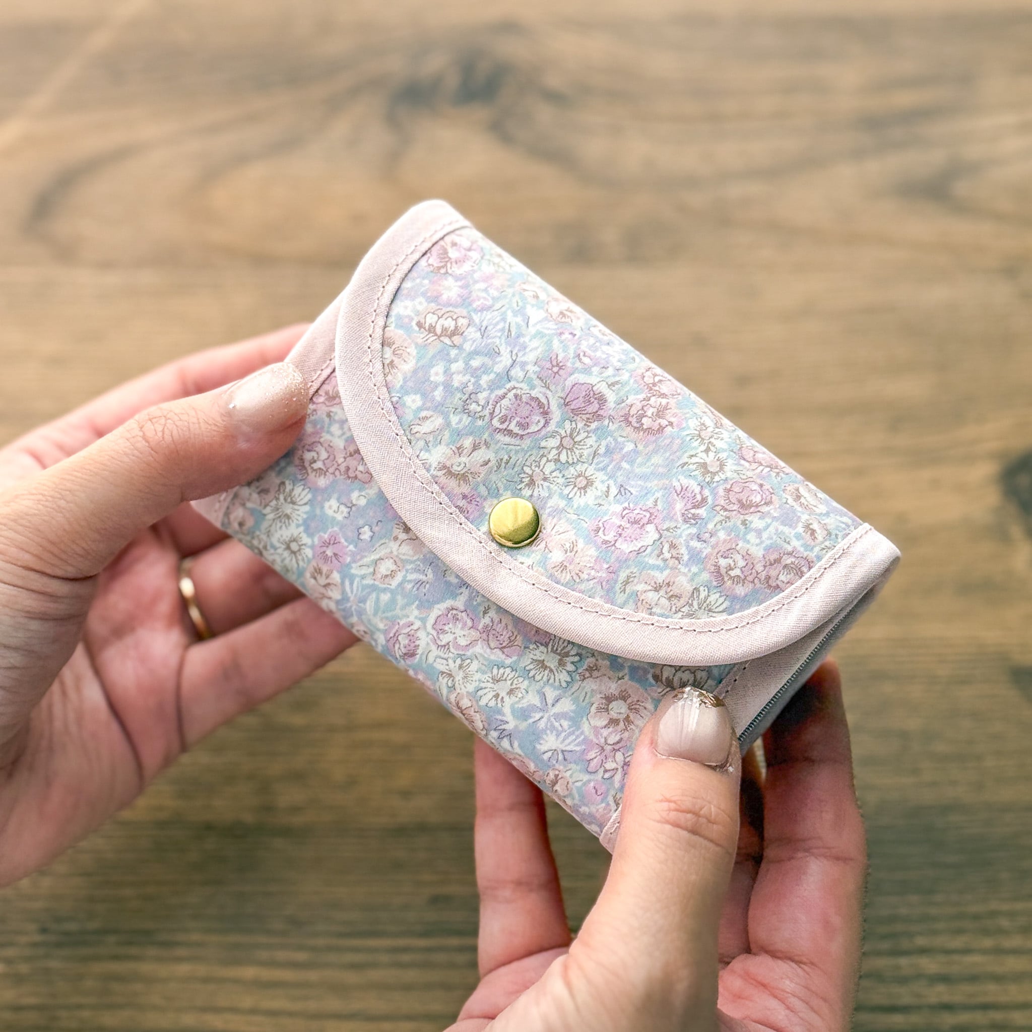 ●コンパクトなサイズ:手のひらに収まるサイズ感で、小さめのバッグにもすっきり収まります。リバティの華やかさを引き立てる、バイアスの組み合わせもポイントです。