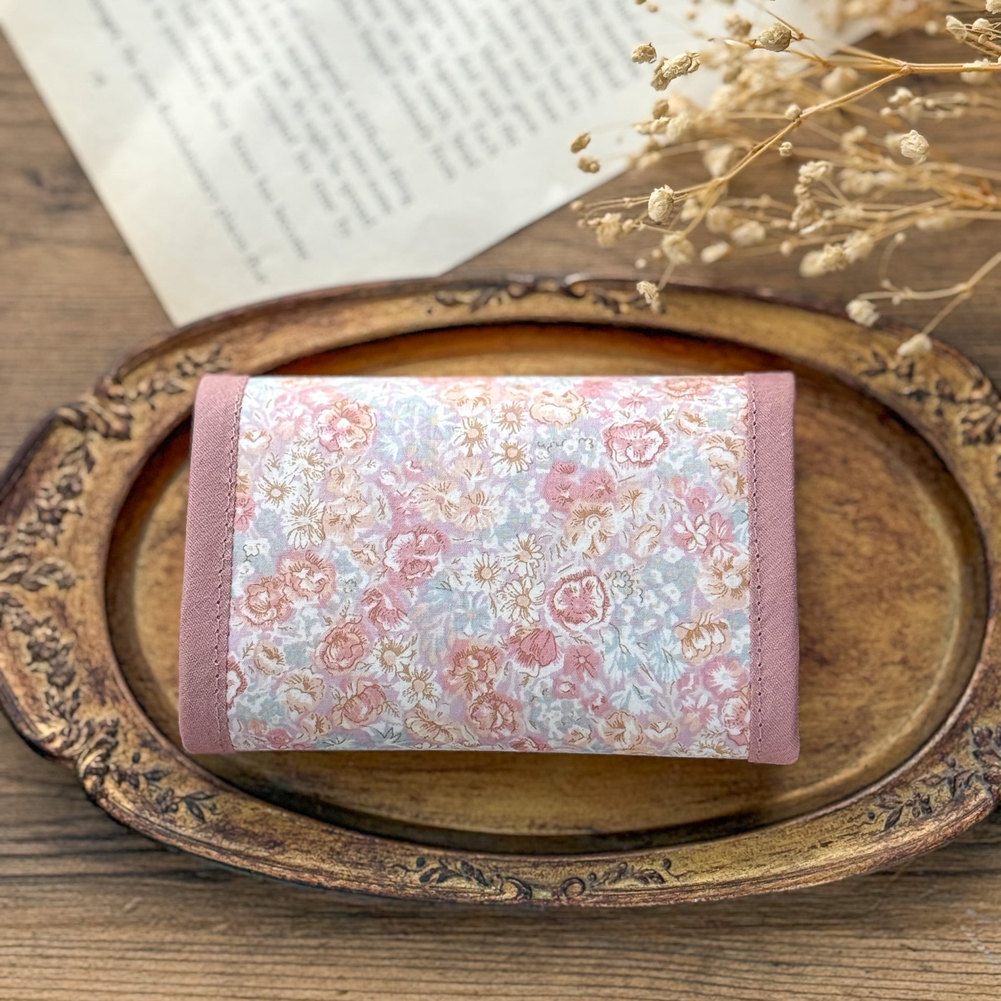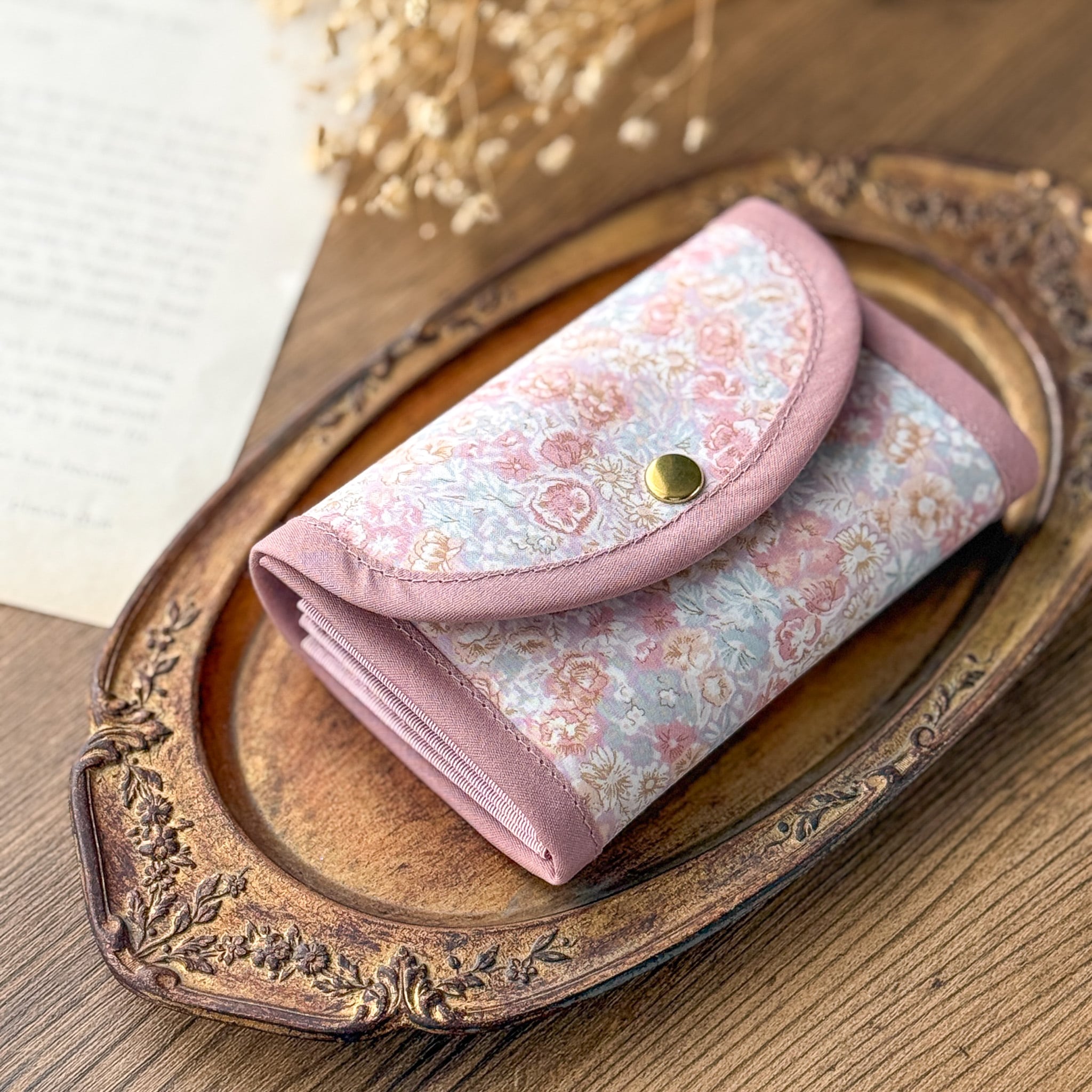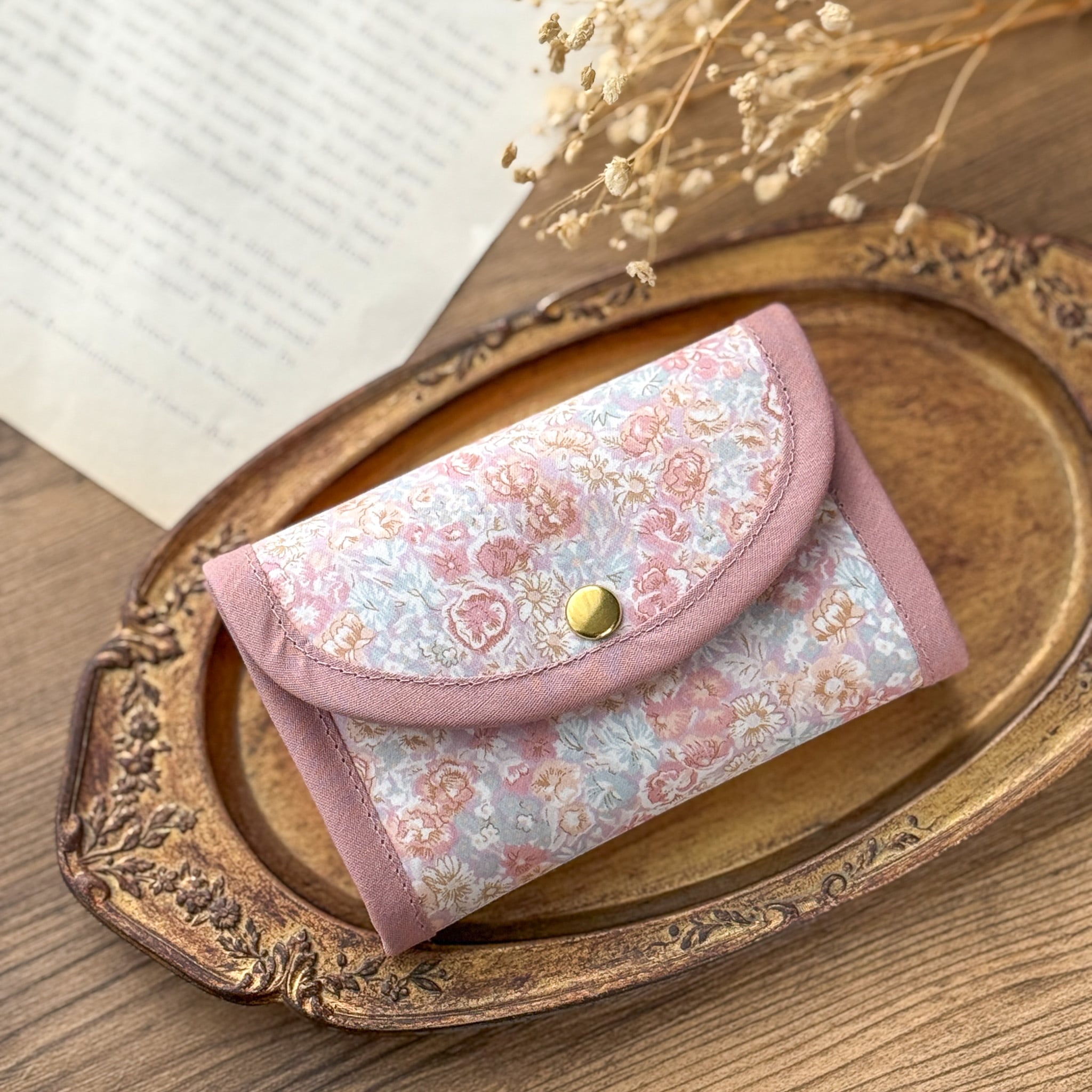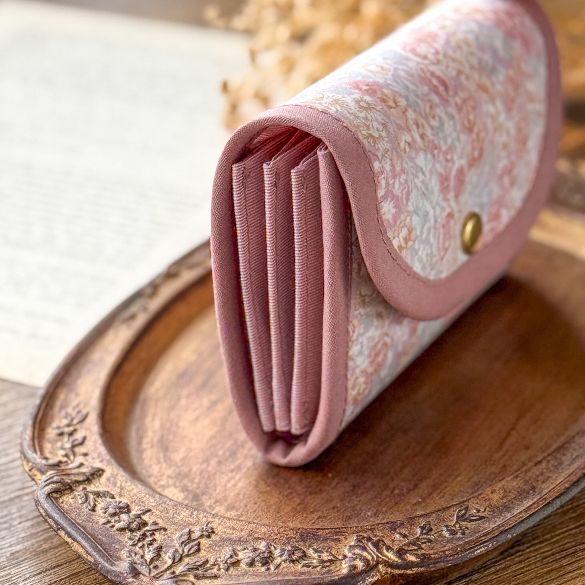 ●コンパクトなサイズ:手のひらに収まるサイズ感で、小さめのバッグにもすっきり収まります。リバティの華やかさを引き立てる、バイアスの組み合わせもポイントです。